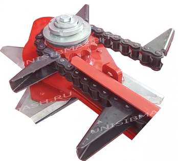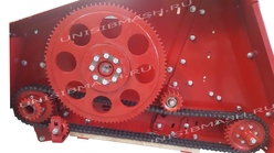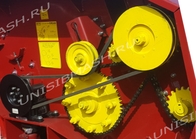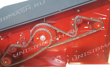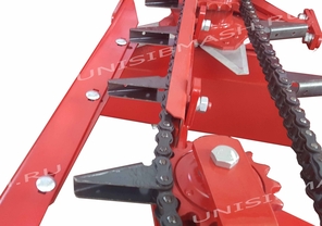 Привод жатки надежный и защищен от перегрузки, имеет предохранительную фрикционную муфту. Цепь шагом 19,05 с увеличенной разрывной нагрузкой. Вращение редукторов режущих аппаратов приводится 4 с левой и 4 с правой стороны, через шнек.